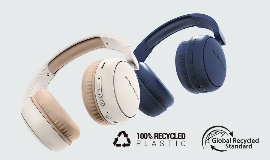 Auriculares inalámbricos fabricados con plástico 100% reciclado, con certificación GRS. Además, los materiales utilizados en el packaging son también respetuosos con el medio ambiente (certificación FSC). Porque creemos que una forma más sostenible de escuchar música es posible. ¡Únete al cambio!